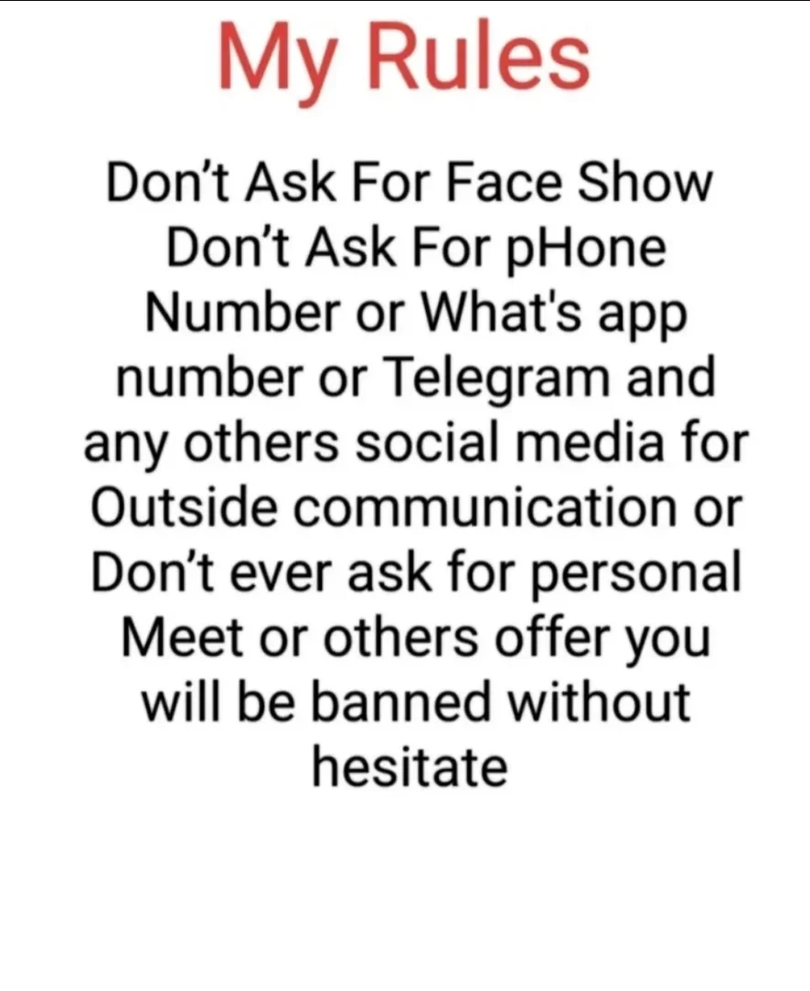 Don’t be rude Don’t ask for Face show. Do not ask me to Communication in others sites like Instagram, WhatsApp, Facebook, imo or any other social media i don’t use any social media and don’t ask for meet. If you don’t follow any of my rules I will ban you.