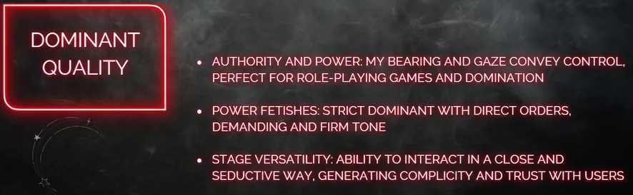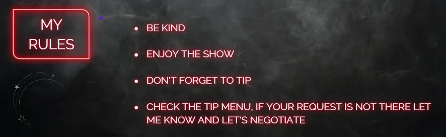 Doggy style, Erotisk dans, Kukkvurdering, Fotfetish, Onani, Oljeshow, Spanking, Skittensnakk, Stripping, Gnidning, Røyking, Precum, Massasje, Orgasme, Hardcore